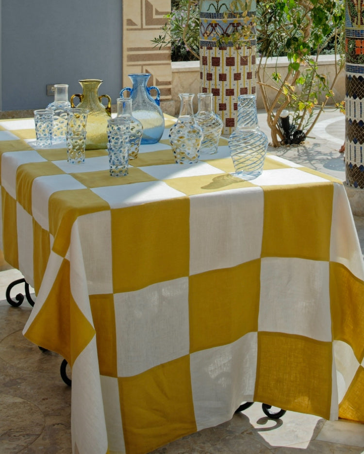 This terracotta and natural linen tablecloth is made from squares in two different colors. It is a classic, reminiscent of cosmopolitan Alexandrian summers. Chf 339.-